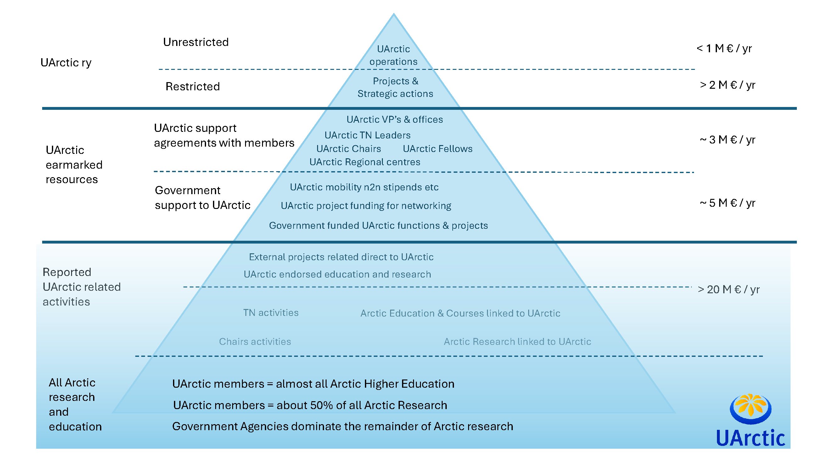 Although UArctic is a small organization with a small economy, it has enormous potential. The legal entity UArctic ry, or UArctic Association, only manages a few million euros per year, but that is just the tip of what we call the finance pyramid. Most of UArctic staff and leadership, the leads of Thematic Networks, and all UArctic Chairs have agreements with some financial commitment from their host institutions. That money does not flow through UArctic, and the total sum is bigger than the money we control centrally. Further, the government funding towards UArctic that stimulates collaboration between Thematic Networks and Chairs and also enables northern mobility – another important earmarked resource for UArctic – is also not directly controlled by the network, but we are part of deciding on how the funding is used and who receives it. This middle part of the finance pyramid, meaning the funding that makes UArctic activities possible but is not controlled by UArctic, together forms a much bigger portion of our actual economic value than the little tip of the pyramid. Below all of this, forming the base layer of the finance pyramid, are the activities of Thematic Networks, as well as all the Arctic education activities somehow related to UArctic that take place at our member institutions. Through annual reporting about such activities, we know these are again much larger than the core value of UArctic. These activities are the big deliverable – the bulk of what happens in the UArctic network.