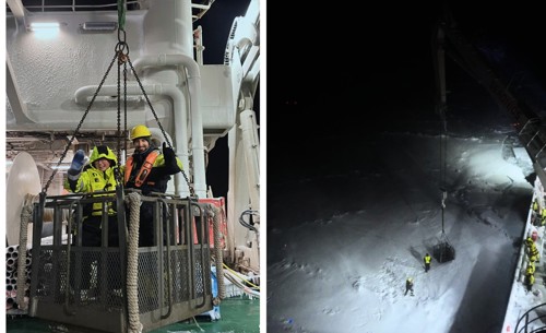 Figure 4: On the left, Mari H. Eilertsen (UiB) and Claudio Argentino (UiT) are in the transfer basket, ready to go onto the ice. On the right is the ice station. Photo: John Jgrzinich