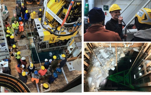 One of the artists who attended the expedition was Gry Bagøien, a talented Danish sound performer whose work seeks to connect humans with the Ocean through song. In the early days of the cruise, she used a speaker in the moonpool (the opening to the sea in the ship's central hangar where the ROV (remote operated vehicle) is submerge) to project her voice into the ocean, attempting to harmonise with the sounds created by the underwater robot during its dives. By employing a hydrophone to capture her vocal performance, she aimed to establish a new language that resonates with the diverse elements of the ocean, including the ROV itself, marine life, and the cold waters surrounding them. Her presence onboard culminated in a spontaneous singing performance around the moonpool, with all the expedition participants and many crew members gathered to sing for the sea and their underwater robot. A microphone recorded their song, which was then played through an underwater speaker. This performance not only aimed to reinforce our awareness of our dependence on the seas but also prompted reflection on the use of advanced technology to explore deep-sea environments that are inhospitable to humans.