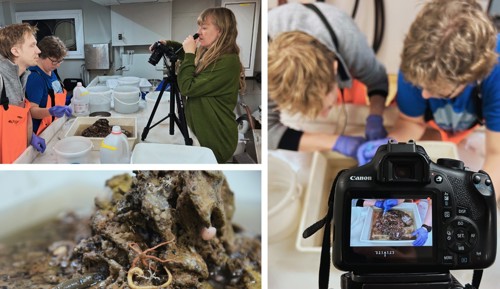 On the second leg of the expedition, Thorgerdur Olafssdottir, a visual artist from Iceland, also joins the team. She has been closely observing the scientists in the laboratories, examining the carbonate rocks, marine organisms, and waste collected from the ocean floor by the ROV. Her work explores themes of care, continuity, and the afterlives of the samples brought aboard.