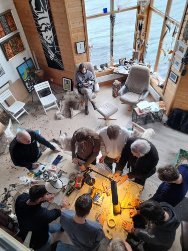 The intensive week included several highlights. One of them was a visit to Fleinvær, a small island about an hour's boat ride from Bodø. In Fleinvær, we visited the art studio of Are Andreassen and the Arctic Hideaway. Are Andreassen introduced his studio and shared how he hosts visitors for graphic printing workshops. Are Andreassen physically included visitors in his artwork, offering art-as-a-service to incoming visitors. The students themselves engaged in his art-as-a-service and discussed their art-as-a-service concept with him.