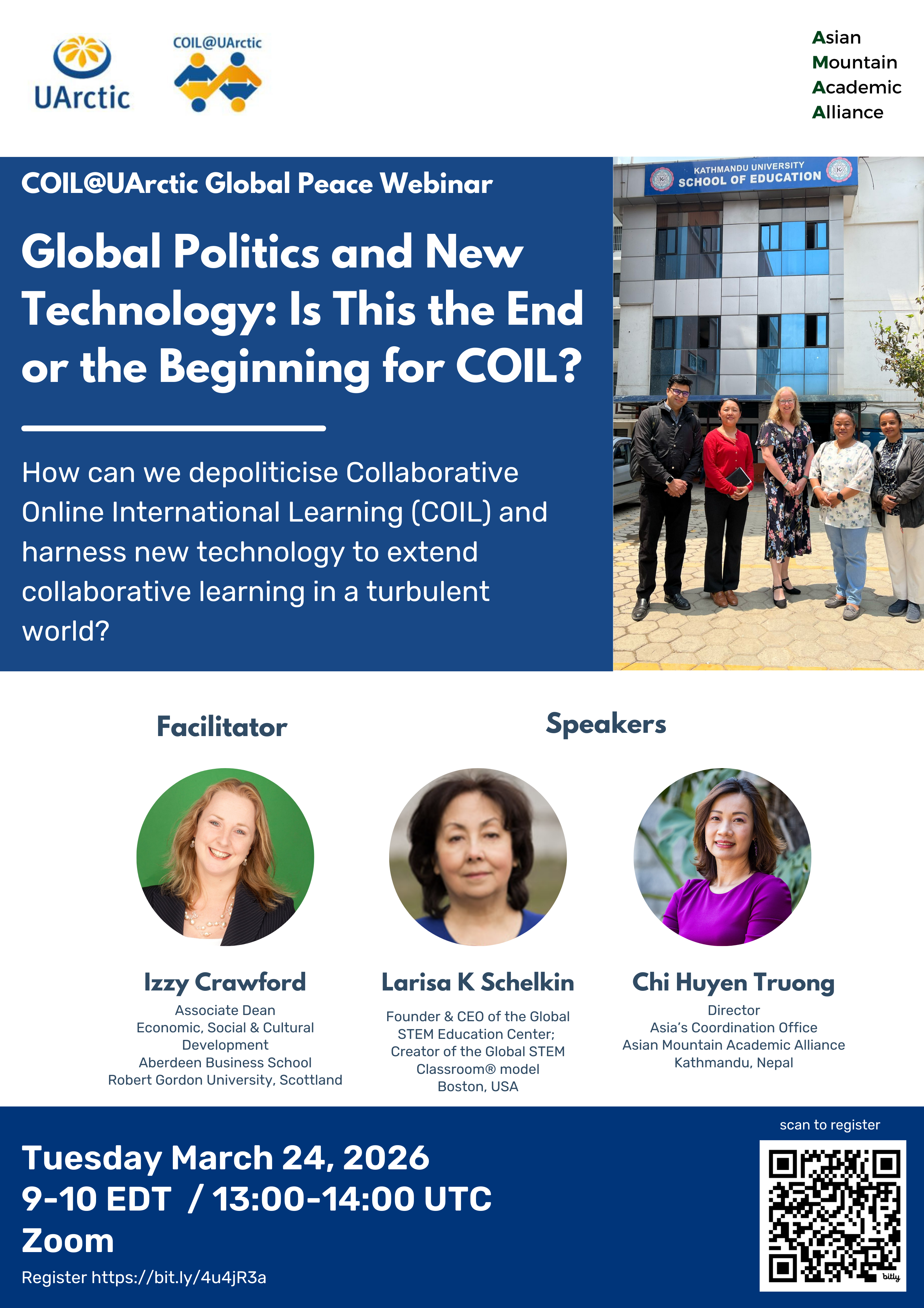 The session will be facilitated by Izzy Crawford, Associate Dean for Economic, Social & Cultural Development at Robert Gordon University in Scotland. Speakers include Larisa K. Skelkin, Founder and CEO of the Global STEM Education Center based in Boston, and Chi Huyen Truong, Director of the Asian Coordination Office of the Asian Mountain Academic Alliance in Kathmandu, Nepal.