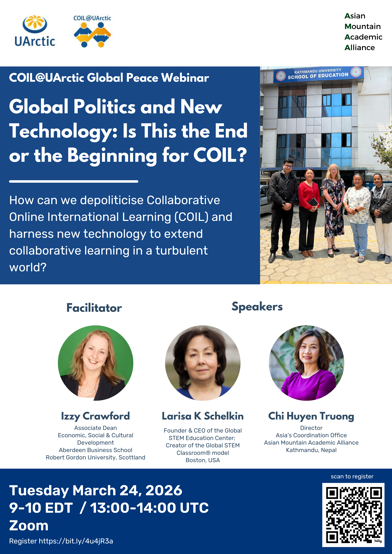 The COIL@UArctic Global Peace Webinar series will continue this month with a session titled “Global Politics and New Technology: Is This the End or the Beginning for COIL?” The event will take place online on March 24, 2026.