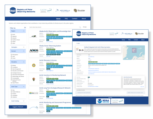 Developed through a collaboration between the Sustaining Arctic Observing Networks (SAON) initiative, the Arctic Portal, and the University of Colorado Boulder, with support from SAON and the NOAA GOMO Arctic Research Program, RoPON is designed as a growing, distributed platform. Authorized network representatives can contribute and update content, helping ensure the registry remains current and relevant.
