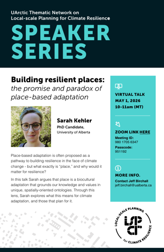 Thematic Network on Local-scale Planning for Climate Resilience will host the next Speaker Series event: "Building resilient places: The promise and paradox of place-based adaptation" online via Zoom on May 1, 2026. The session will feature Sarah Kehler from the University of Alberta, Canada.